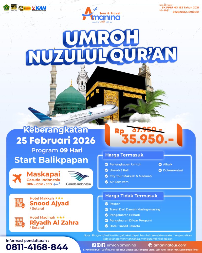 💫 Ramadhan adalah waktu terbaik untuk menata hati dan mendekat pada Allah. Jadikan Nuzulul Qur’an kali ini bukan hanya momen peringatan, tapi pengalaman nyata dalam ibadah di Tanah Suci bersama Amanina Tour & Travel.