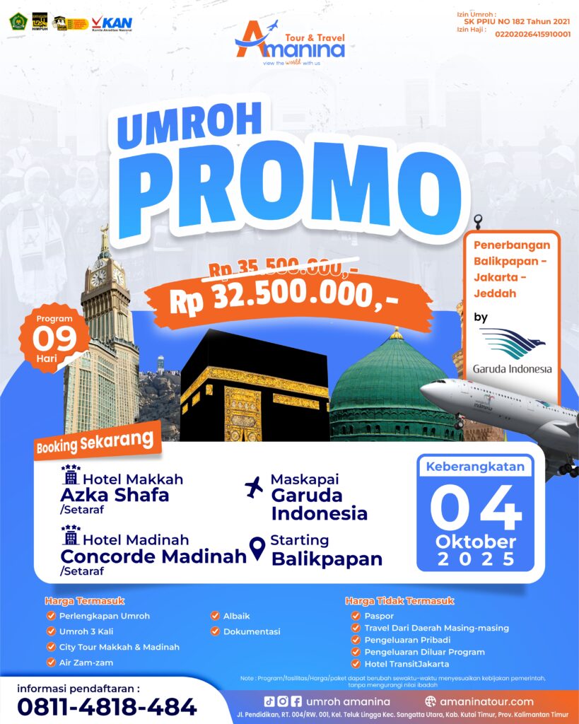 Jangan lewatkan kesempatan emas untuk menunaikan ibadah umroh dengan harga super hemat! Segera daftar sekarang dan wujudkan impian Anda untuk mengunjungi Baitullah! Seat terbatas, jangan sampai kehabisan!