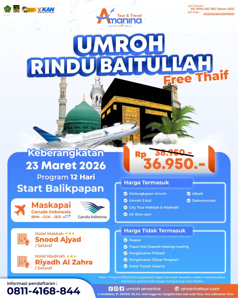 Langkahkan kaki ke Tanah Suci bersama Amanina Tour & Travel, untuk menunaikan ibadah umroh penuh keberkahan dan menikmati perjalanan spiritual istimewa ke Kota Thaif.